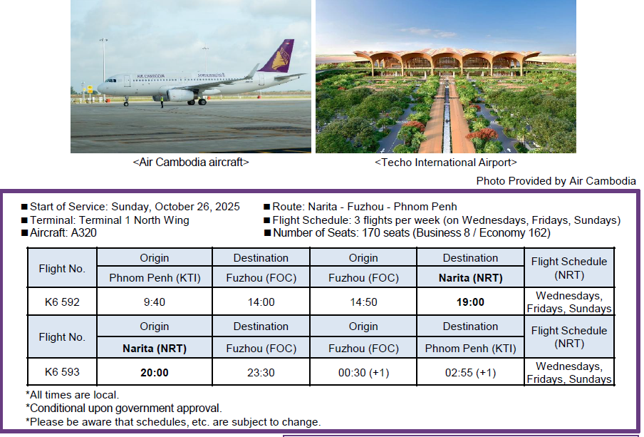 Air Cambodia (IATA Code: K6) will launch a new flight route between Narita and Phnom Penh (Cambodia) via Fuzhou, China, from October26, 2025. The company, Cambodia's national flag carrier, will be the only airline connecting Japan and Cambodia.