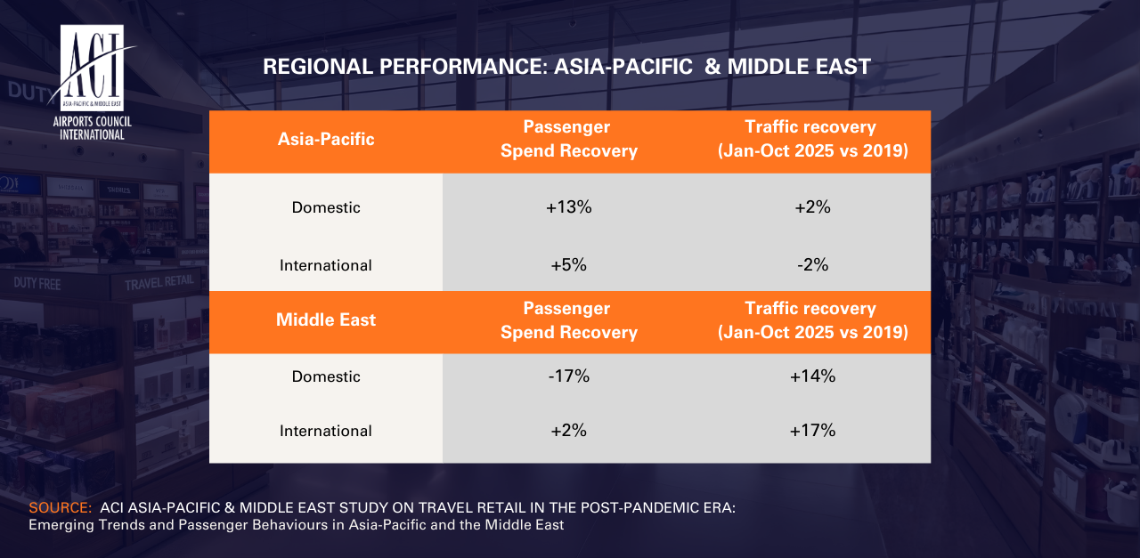 - Asia-Pacific: A modest 2% rise in domestic traffic translated into a strong 13% increase in passenger spend (sales per passenger) in 2025 (January to October) as compared to 2019, reflecting changing consumer behaviour and higher-value purchases. Luxury goods (+9%) and local products (+7%) were at the forefront of this growth.