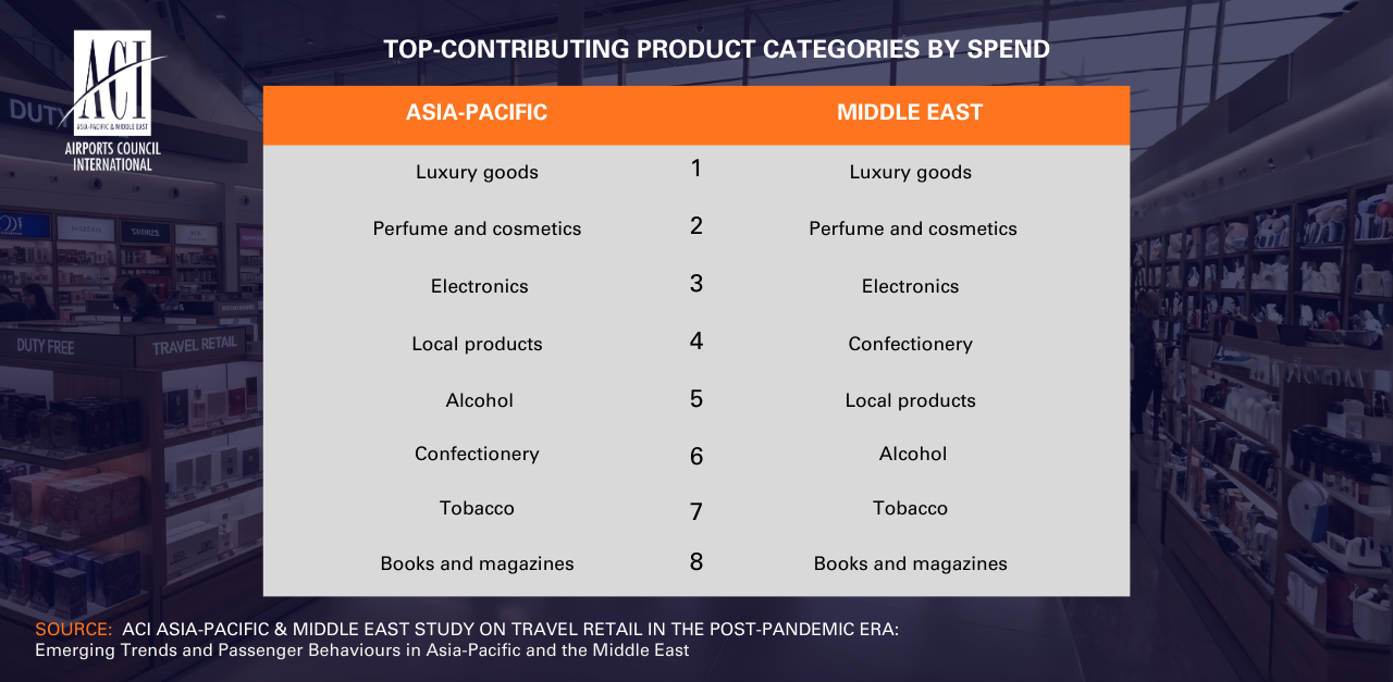 - Across Asia-Pacific and the Middle East, airport retail performance shows strong uniformity, with the same categories consistently leading sales. Luxury goods and perfumes & cosmetics rank as the top two categories in both regions, reinforcing airports as trusted destinations for premium, duty-free and gifting purchases. Electronics typically rank third, supported by pricing advantages and last-minute convenience, and together these top three categories generate the highest net margins for airports.