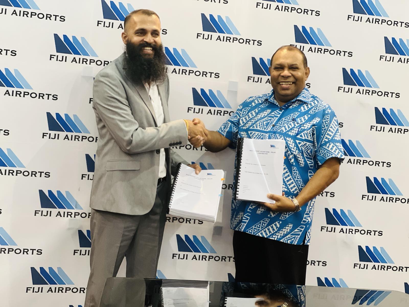 Fiji Airports chief executive Mesake Nawari and CBS Power Solutions Fiji Limited director Amit Singh, following the contract signing in Nadi