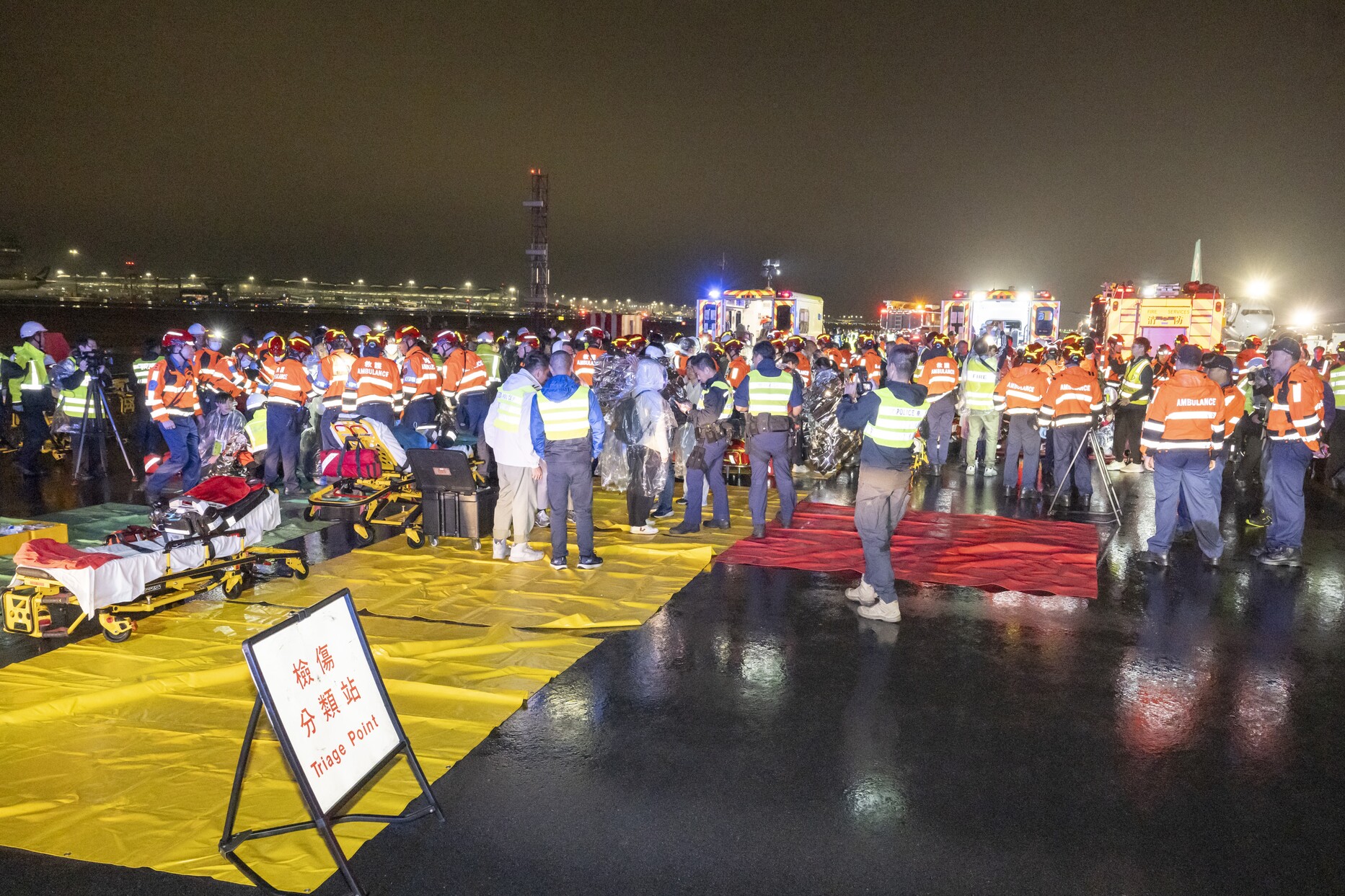 The exercise started at around 0215hrs when a simulated departure flight with 120 passengers aborted takeoff on the Centre Runway, due to an urgent report from the cabin crew regarding smoke emitting from a power bank, under a passenger’s seat. The simulated aircraft's tire burst when it was braking and it veered off the runway. Its landing gear collapsed and then caught fire. Air Traffic Control Tower personnel immediately activated the crash alarm. Airport Authority Hong Kong (AAHK) activated the Airport Emergency Centre to facilitate coordination and communication among various government departments, airport communities and organisations. Emergency services, including the Fire Services Department (FSD) and the Hong Kong Police Force (HKPF), promptly arrived at the incident site to carry out firefighting and rescue, render medical care, convey the casualties, and provide other support.