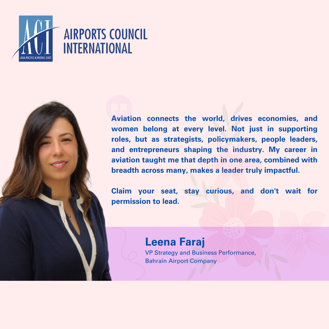 🌸 Leena Faraj, VP Strategy and Business Performance, Bahrain Airport Company, also the Vice-Chair of ACI APAC & MID Regional Economics Committee highlights the critical role women play in aviation and advocates for greater representation of women in key positions.