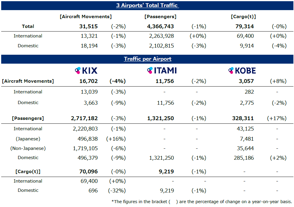 At Kansai International Airport, the number of non-Japanese passengers was 94% year-on-year, falling belowthe previous year’s level for the first time in three years and eleven months, since January 2022. The numberof Japanese passengers increased to 116% year-on-year; however, total international passengers stood at 2.22million, or 99% year-on-year, likewise falling below the previous year’s level for the first time in three yearsand eleven months.