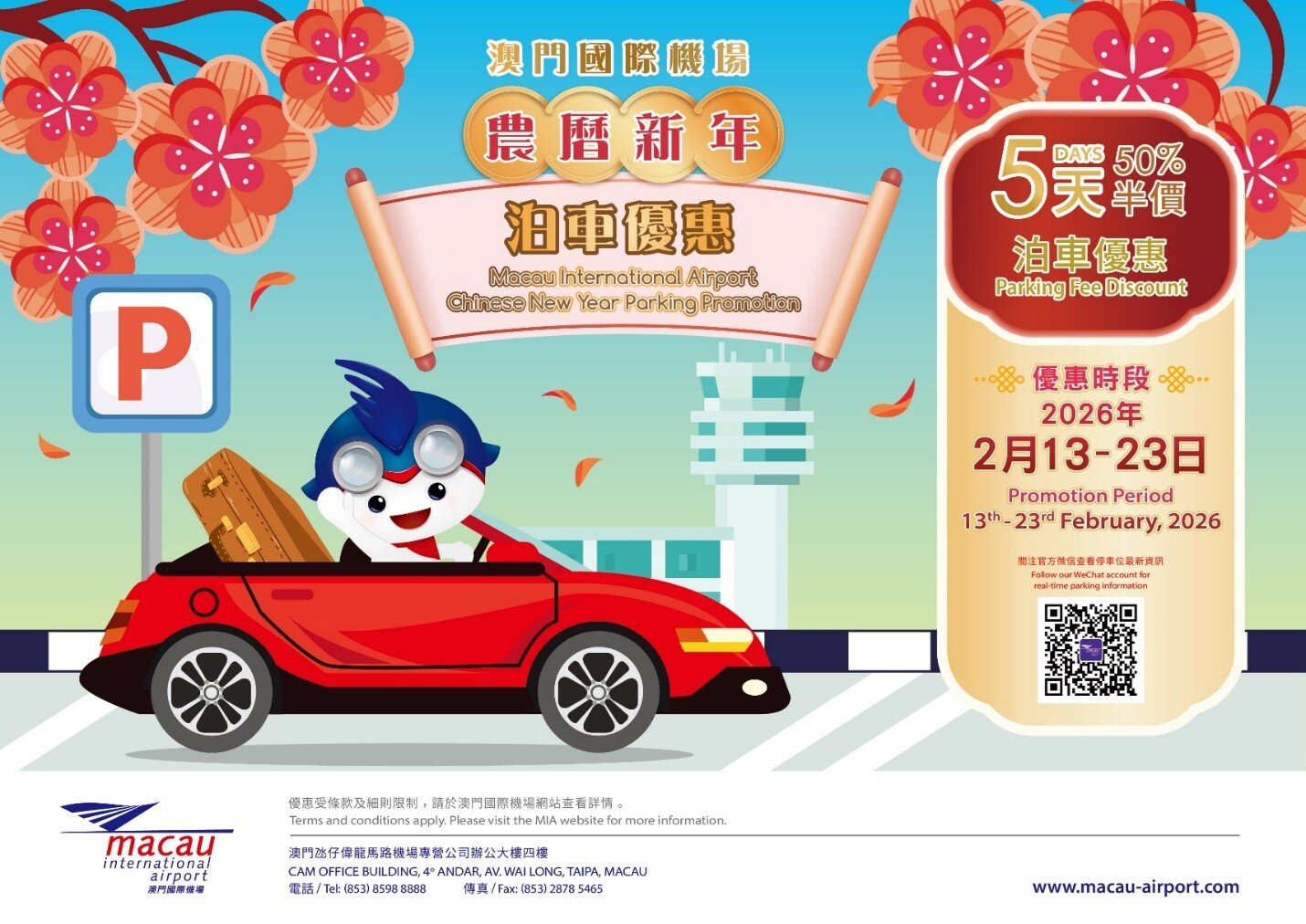 To celebrate the upcoming Chinese New Year, Macau International Airport (MIA) is glad to announce that travellers can enjoy up to five consecutive days of 50% parking fee discount at Macau International Airport from 13th to 23rd February 2026. The parking offer is applicable at MIA South and North Parking Lots.