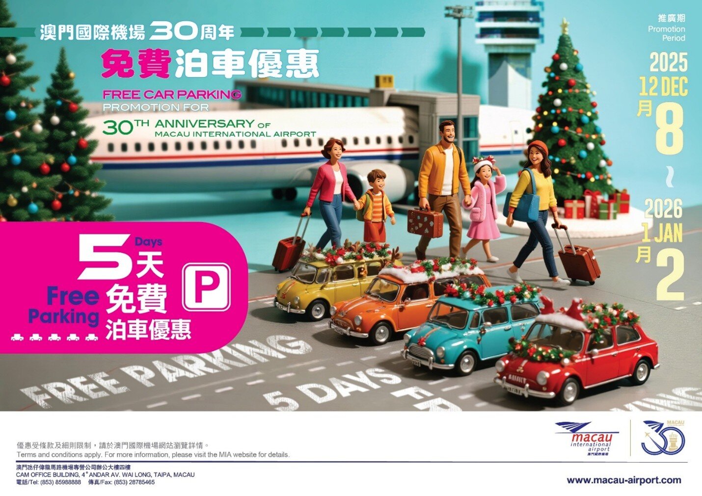 To celebrate the 30th Anniversary of Macau International Airport (MIA), MIA is going to launch the 30th Anniversary Parking Promotion during the winter holiday travel peaks as to enhance passenger convenience. From 8th December 2025 to 2nd January 2026, travellers can enjoy FREE parking for 5 consecutive days and the promotion is applicable at MIA South and North Car Park.