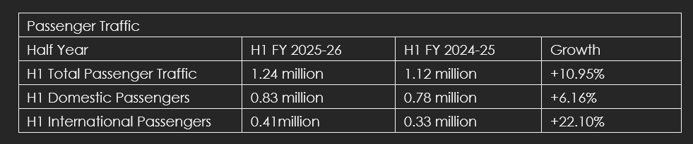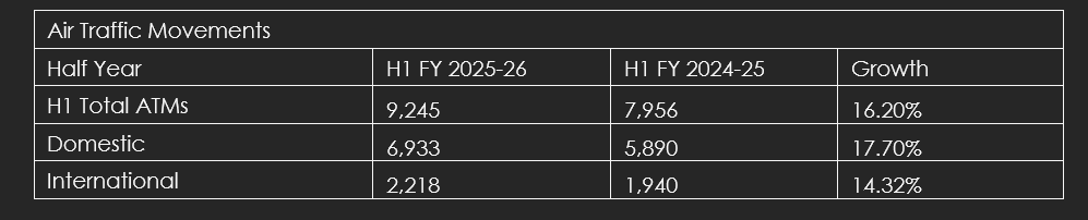 The Airport efficiently facilitated 9,245 Air Traffic Movements (ATMs) during the first half, marking a 16.20 percent increase over H1 FY 2024–25. During the half year, International ATMs at 2,218 recorded a growth of 14.32 percent, while domestic ATMs at 6,933 saw a growth of 17.70 percent. The airport also handled 94 General Aviation or chartered flight movements in the first six months.