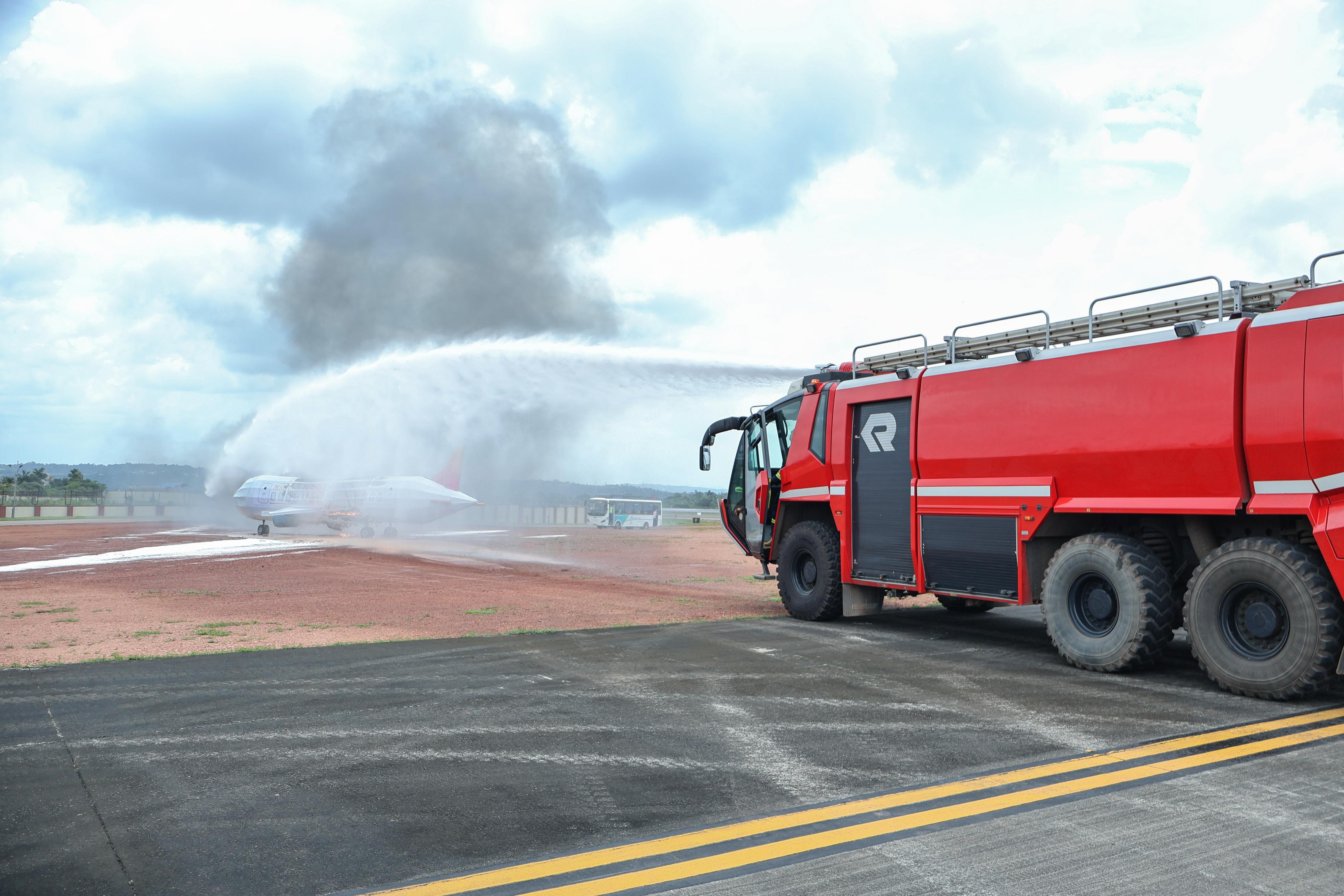 The crash fire tenders of Mangaluru International Airport dousing the 'fire' that enveloped the 'aircraft' at Mangalam 2025 exercise held at the Airport on Friday.