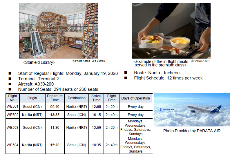 Parata Air (IATA code: WE) has been operating charter flights on the Narita and Seoul (Incheon) route since November 17, 2025. It will begin operating regular flights on the same route starting from January 19, 2026.